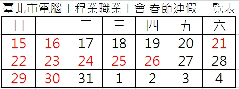 2022-12-15 2023年春節連假上班日一覽表,祝 新年快樂 2023年春節連假上班日一覽表 2023/1/21-2022/1/26 工會放假哦 2023/1/27、28 工會正常上班 農立初六開工 回上一頁