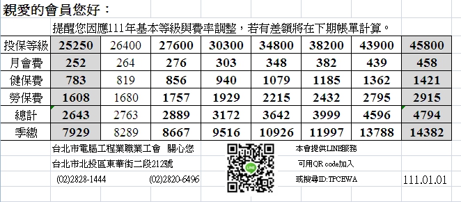 111年1月1日起 每月基本工資調整為25,250元! 提醒您因應您111年基本等級調整,若有差額將在下期帳單計算。